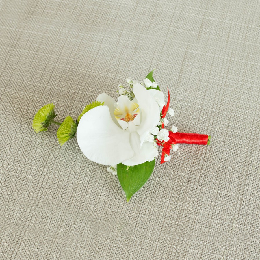 Our Exquisite Groom Buttonhole is the perfect finishing touch for any groom. This beautiful bouquet showcases white orchids, green mini chrysanthemums, and gypsophila, elegantly arranged and tied with a vibrant red ribbon. Each flower is carefully selected to ensure a stunning and unique display.